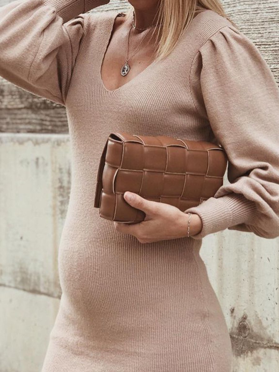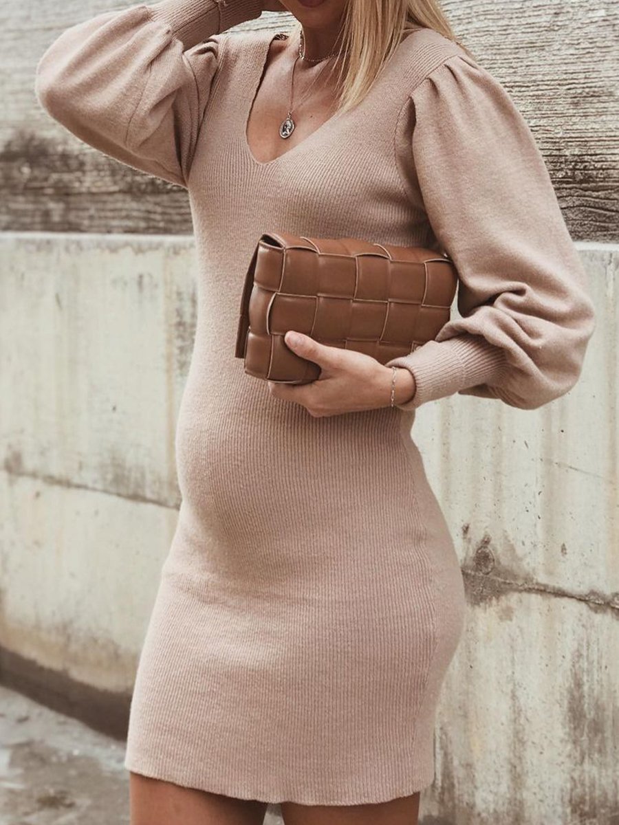 V-neck Puff Sleeve Simple Knitted Maternity Dress