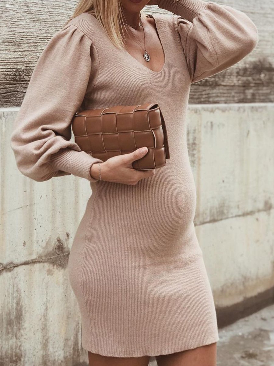 Product: V-neck Puff Sleeve Simple Knitted Maternity Dress